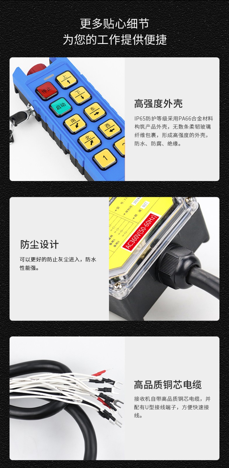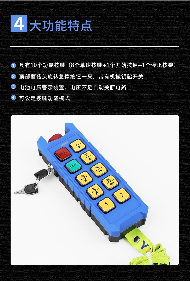 產(chǎn)品廣泛應(yīng)用于機(jī)械、建筑、冶金、汽車(chē)、化工、鐵路、施工等可實(shí)現(xiàn)遙控操作的設(shè)備及場(chǎng)所。
